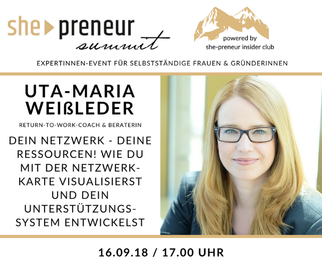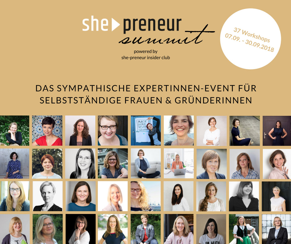 Seit einigen Monaten bin ich Mitglied in der Community she-preneur, einem Netzwerk für Gründerinnen, das vom 7.-30. September 2018 die zweite she-preneur summit mit 37 Online-Workshops inspirierender Expertinnen veranstaltet – mit einem Mix an Beiträgen rund um die Selbständigkeit – vom (Online-)Businessaufbau über Marketingstrategien und Selbstmanagement bis hin zur Visionsentwicklung.