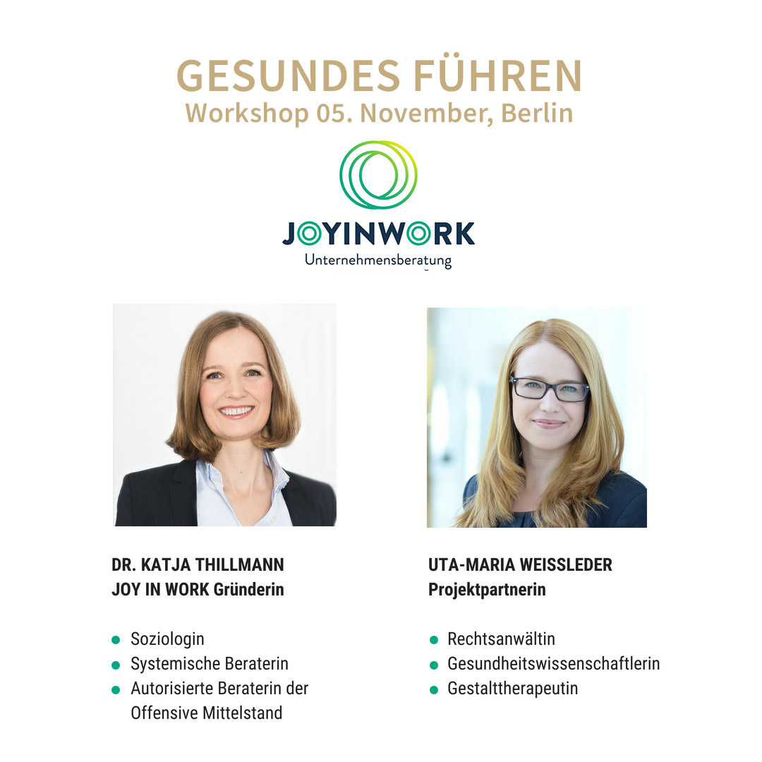Gesundheit und Wohlbefinden sind die Basis für ein zukunftsfähiges, erfolgreiches Unternehmen. Beide Faktoren haben einen nachweislichen Einfluss auf die Motivation und Leistungsfähigkeit der Mitarbeiter. Führungskräfte haben eine Schlüsselrolle für die Schaffung gesundheitsförderlicher Arbeitsbedingungen. Sie sollten als Vorbild voran gehen und durch ihr Verhalten zum Erhalt der Gesundheit und Motivation ihrer Mitarbeiter beitragen. In diesem Workshop geht es darum, das eigene Führungsverhalten zu reflektieren und konkrete Ansätze gesundheitsförderlicher Führung für die eigene Praxis zu erarbeiten.